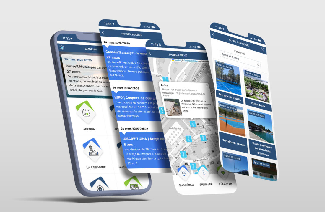 Construit sur Drupal, le site de la Mairie d’Embrun va au-delà du portail institutionnel classique : agenda et actualités en temps réel, application citoyenne mobile pour signaler des dysfonctionnements, cartographie territoriale partagée via Geomas. Une commune de 6 500 habitants qui assume pleinement le numérique.