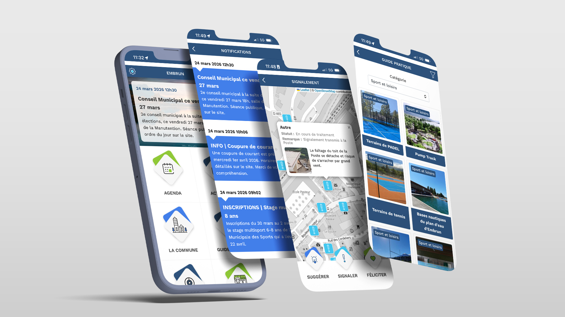 Pour les communes de moins de 5 000 habitants, Notre Commune est une application iOS et Android déployée sous le nom et aux couleurs de votre commune. Notifications, agenda, actualités, accès aux services du portail : une offre packagée déjà en production chez plusieurs communes, sans les coûts d’un développement sur mesure.